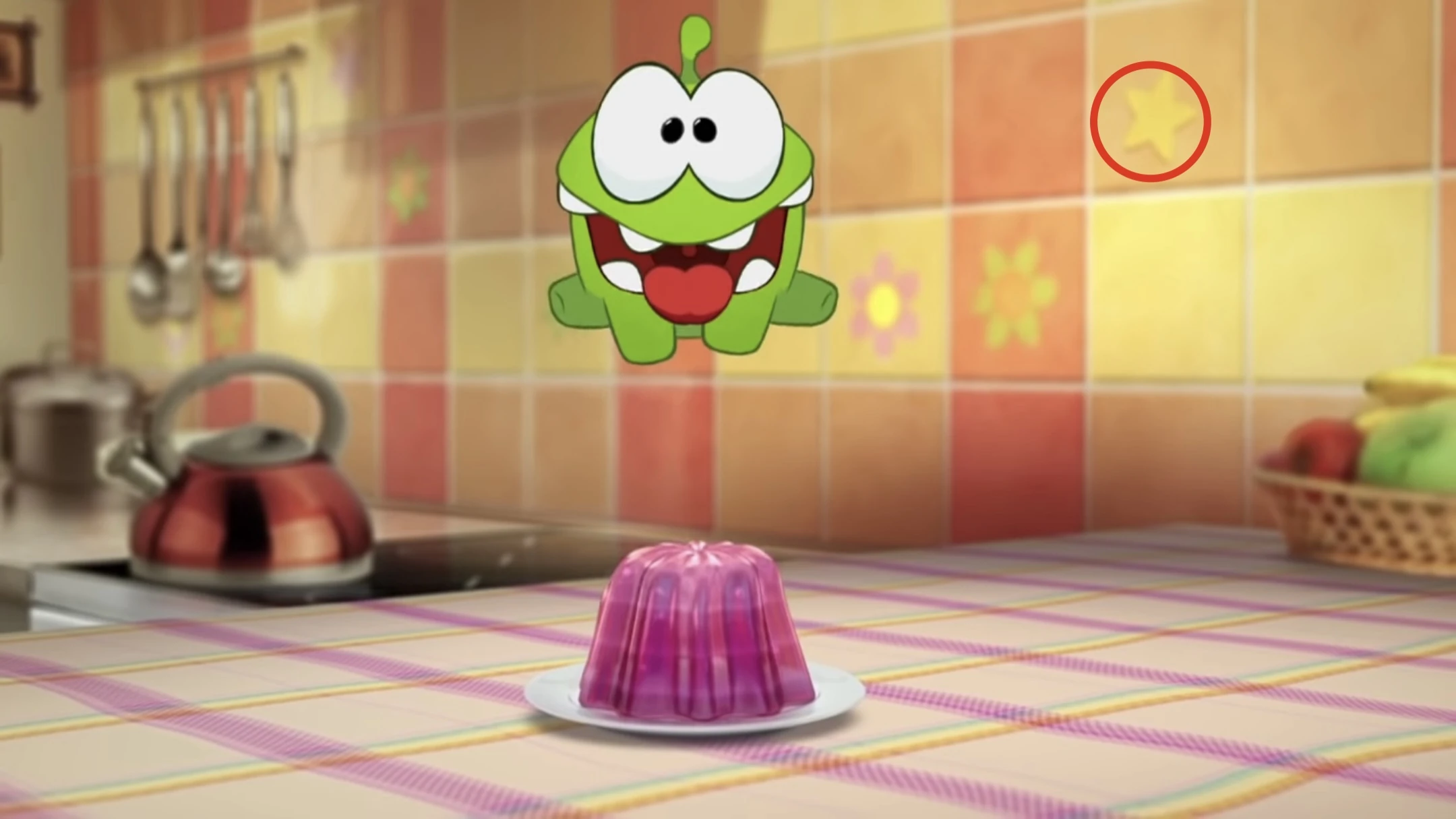The hidden star is on the wall when Om Nom's jumping on the jelly (at 0:54).