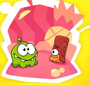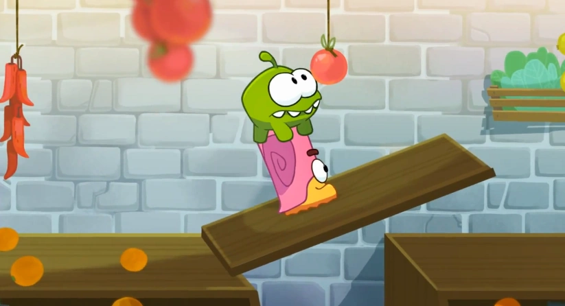 Fruit market is the sixth world in Cut the Rope 2. It introduces Snailbrow, the one-eyed snail who loves fruit. He moves when something hits him or when he is tapped. In episode 27 of Om Nom Stories, fruit market, Om Nom got in the market and met Snailbrow. The fruit market consists of apples, durians, an unknown spiky purple shell fruit, pears, oranges, melons, chilli peppers, bananas, and celery.